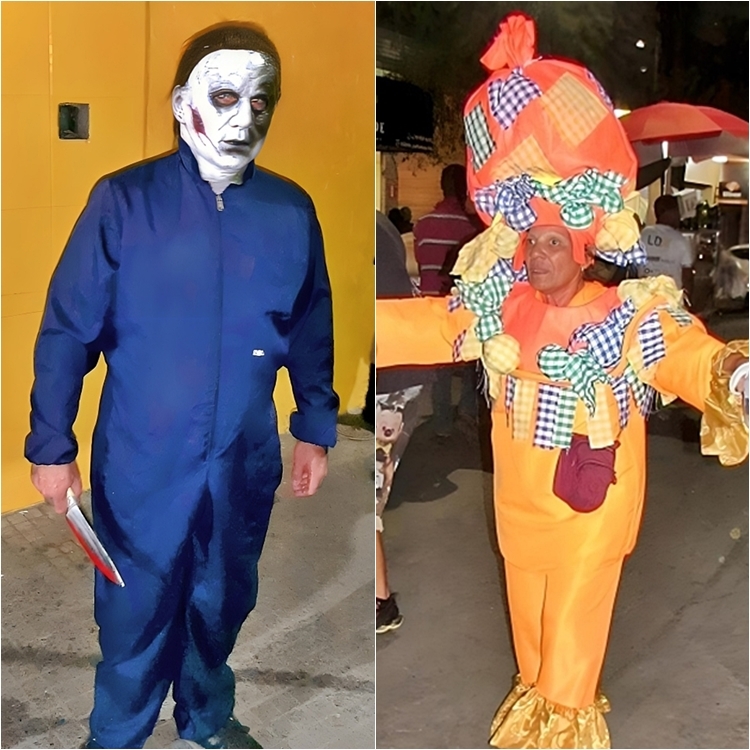 no centro da cidade, fantasiados de personagens